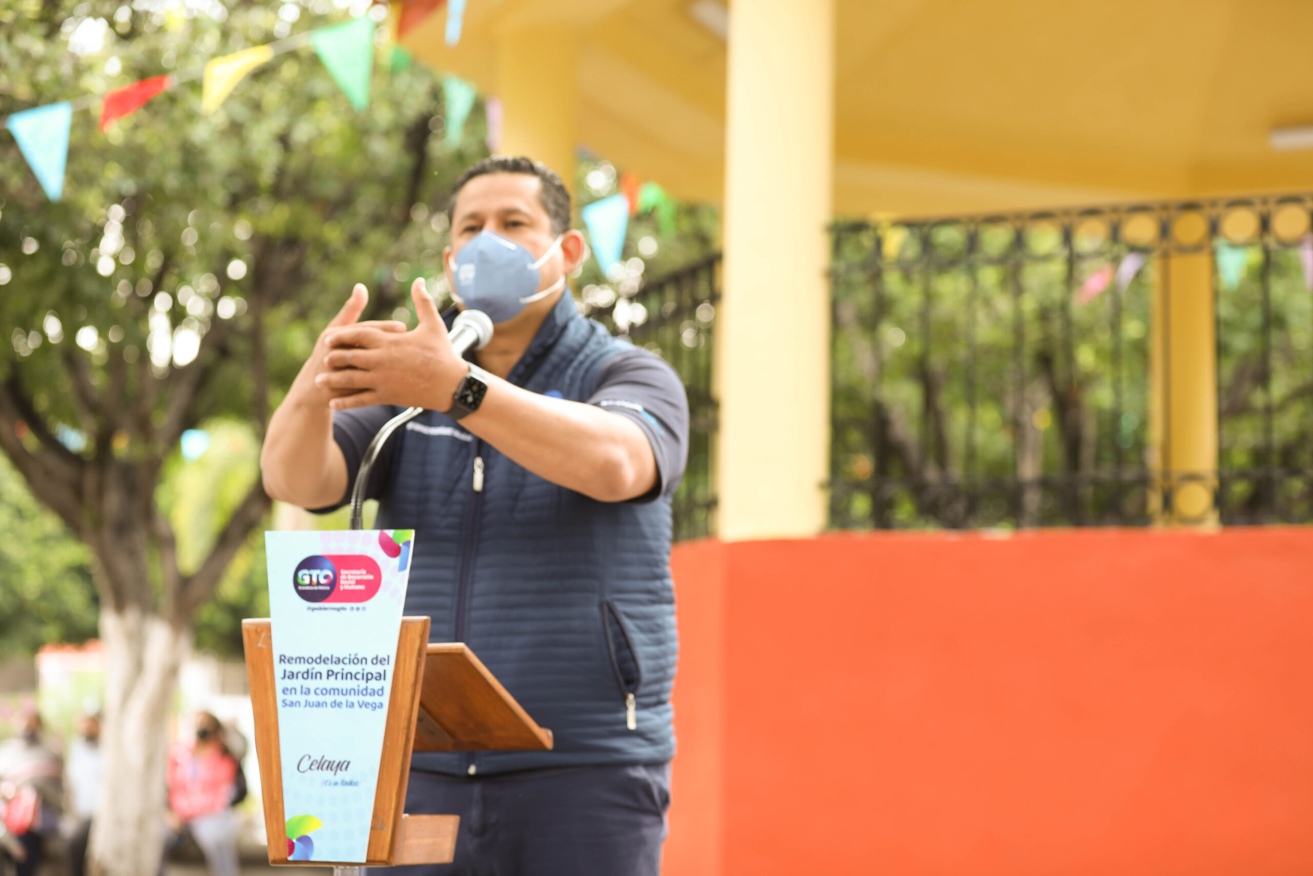El gobernador comentó que se destinaron más de 4 millones de recursos estatales y municipales a las acciones que se llevaron a cabo en San Juan de la Vega, las cuales consistieron en la remodelación de la plaza, los andadores con pisos de pórfido, el kiosco, el área de juegos infantiles, las jardineras, así como el mobiliario urbano y el alumbrado.