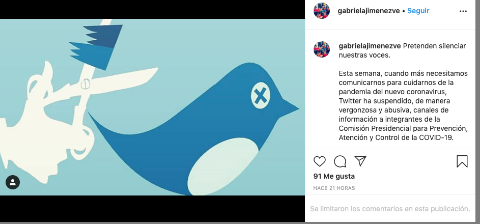 Gabriela Jiménez que es la ministra de Ciencia y Tecnología, se ha visto afectada por la restricción, por lo que tuvo que escribir en Instagram lo sucedido y la falta de comunicación que se les ha impuesto, “Twitter ha suspendido, de manera vergonzosa y abusiva, canales de información a integrantes de la Comisión Presidencial para Prevención, Atención y Control de la COVID-19”.