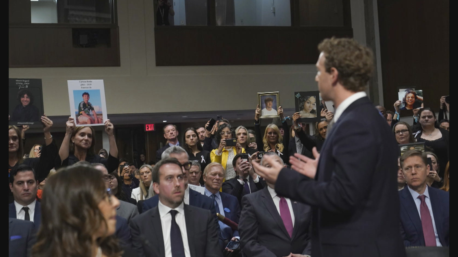 Bajo la presión del senador republicano Josh Hawley, Zuckerberg se puso de pie y se dirigió a las familias que sostenían fotografías de sus hijos que, según decían, habían sido perjudicados por las redes sociales.